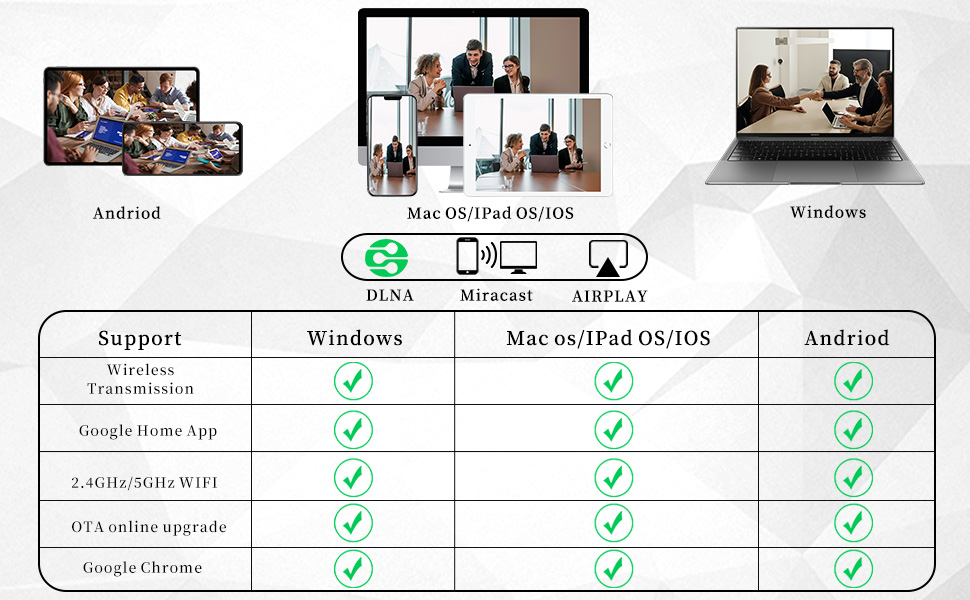 HDMI-compatible device. The device without HDMI-compatibel ports can be used with HDMI-compatible converter. Wirelessly transmit video & audio to TV or projector. Watch movies & TV shows from your Mobile,laptop, PC, MacBook, iPad Pro, A/V receiver, gaming console, PS4/5, Xbox, Nintendo Switch.