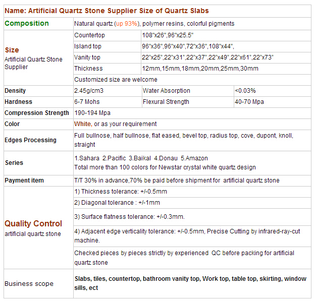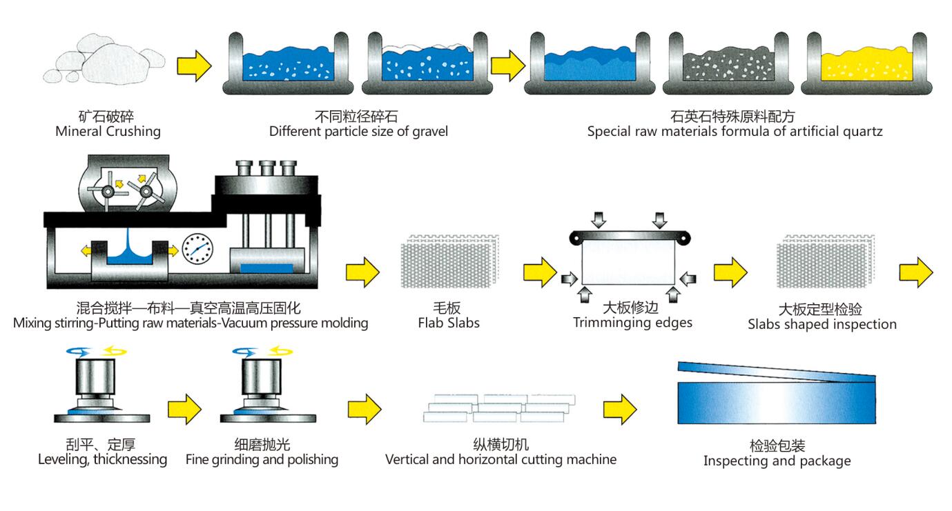 Artificial Quartz is synthesized with high purity acid-washed 93% quartz stone, 7% polymer material and a small amount of inorganic pigment under vacuum condition and through heterogeneous material aggregation technology.