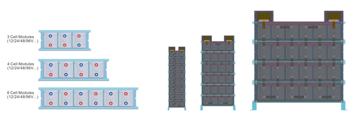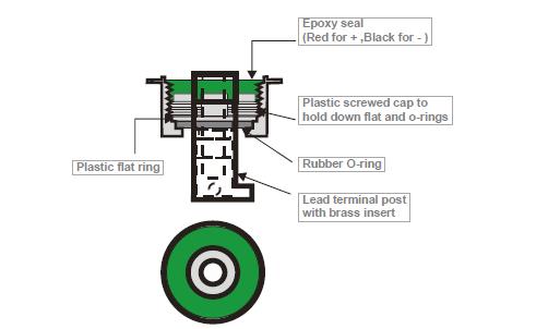 Heavy duty Silver-plated threaded copper alloy terminals for ease of assembly, reduced maintenace and increased safety.Flame arresting, low pressure safety release venting system for individual cells, recognized per U.L.924